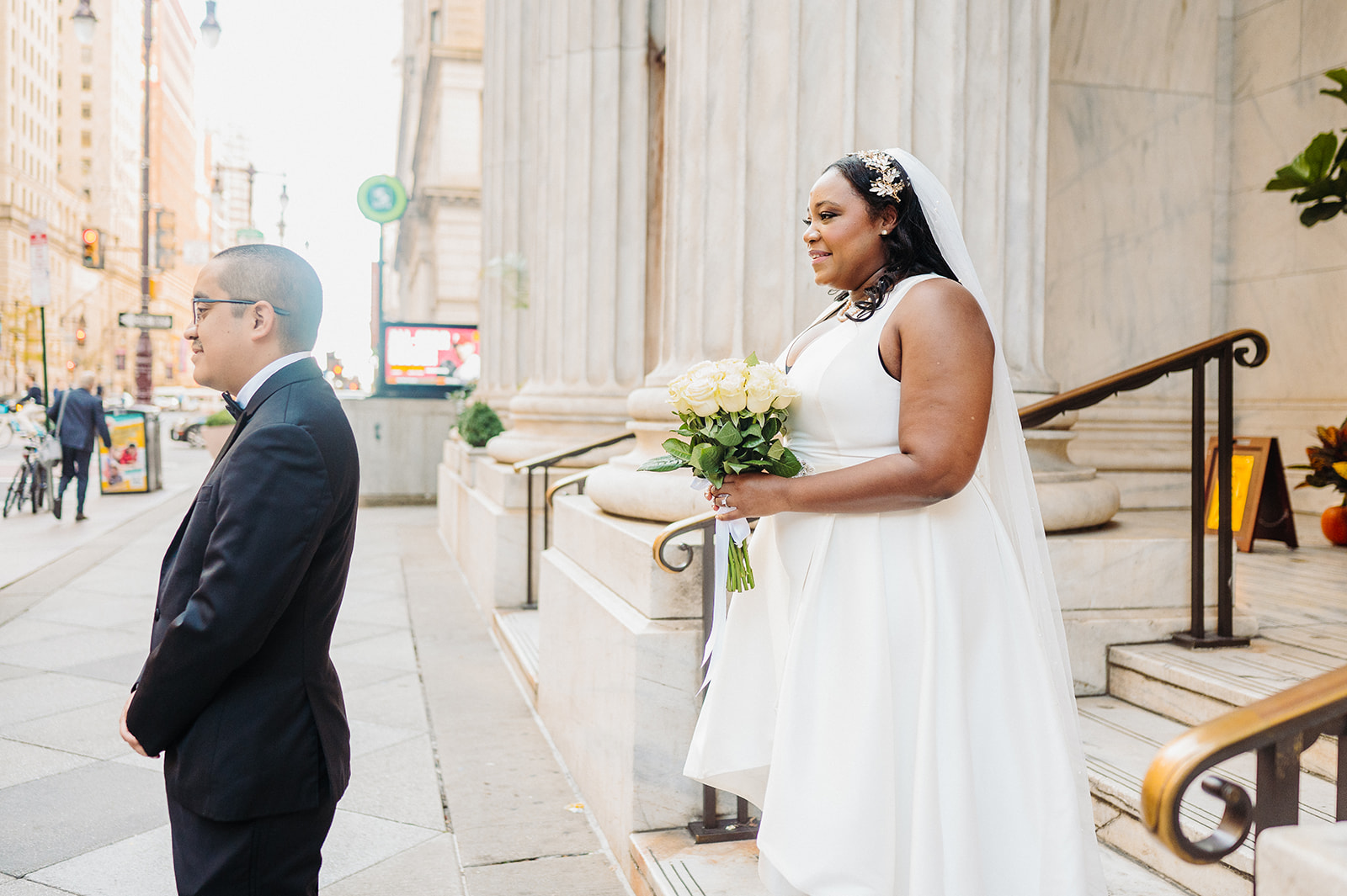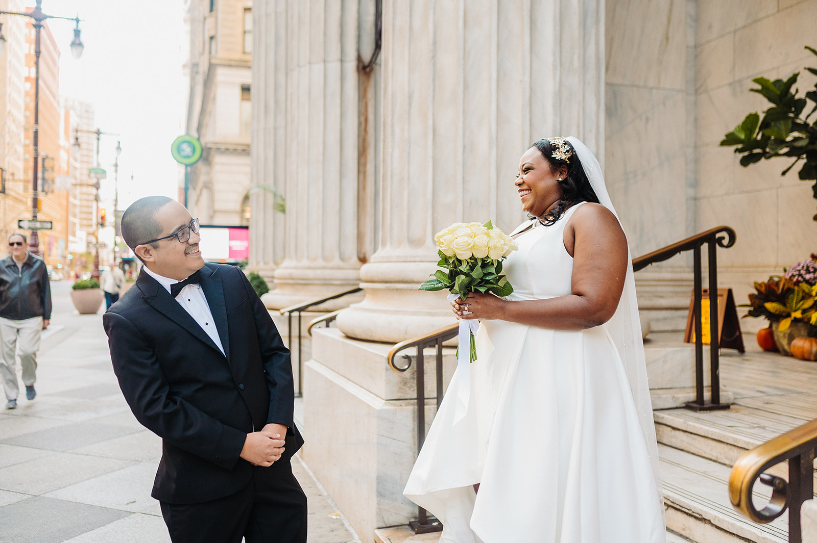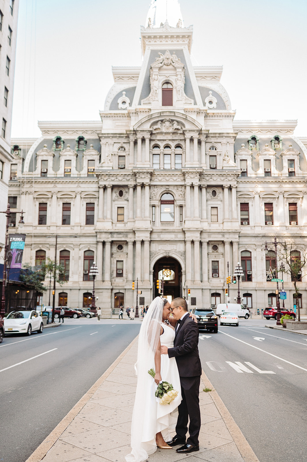 Their day started at the Ritz-Carlton Philadelphia, where they got ready just a few floors apart. There’s always something special about that anticipation—quiet moments filled with nerves, laughter, and love. After slipping into their wedding attire, we stepped outside for a sweet first look right in front of the hotel. It was simple, quick, and filled with the kind of joy that sets the tone for the rest of the day.